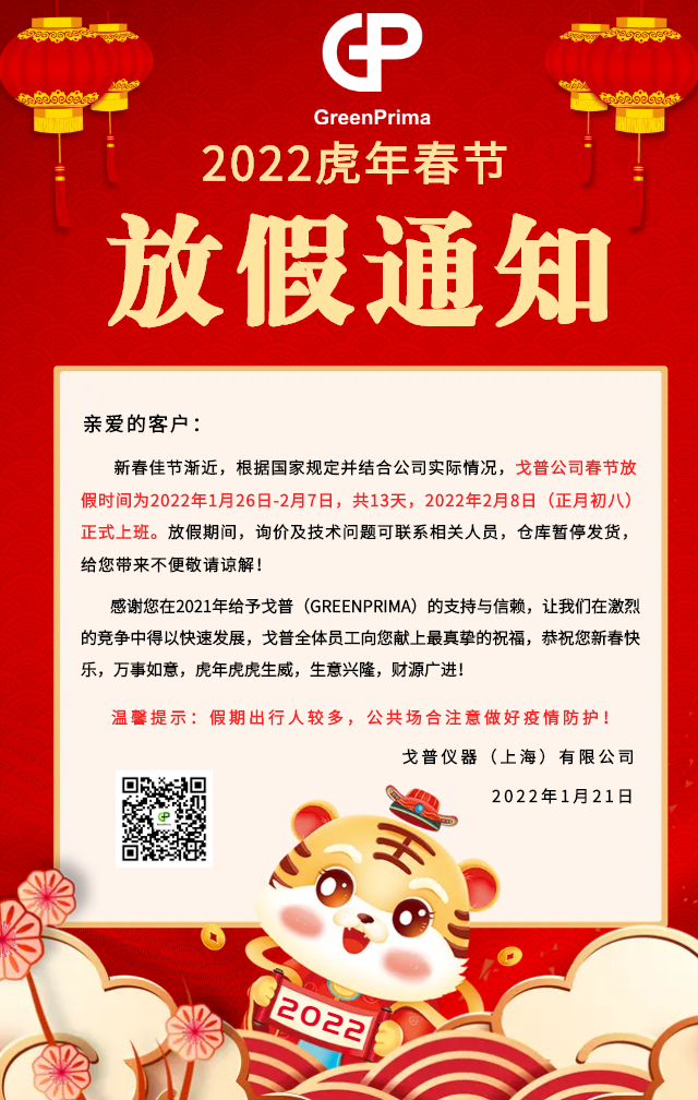 歡歡喜喜迎虎年!戈普公司春節(jié)放假時(shí)間為2022年1月26日-2月7日,共13天,放假期間,有詢價(jià)或技術(shù)問題請撥打相關(guān)人員移動電話,倉庫暫停發(fā)貨,給您帶...