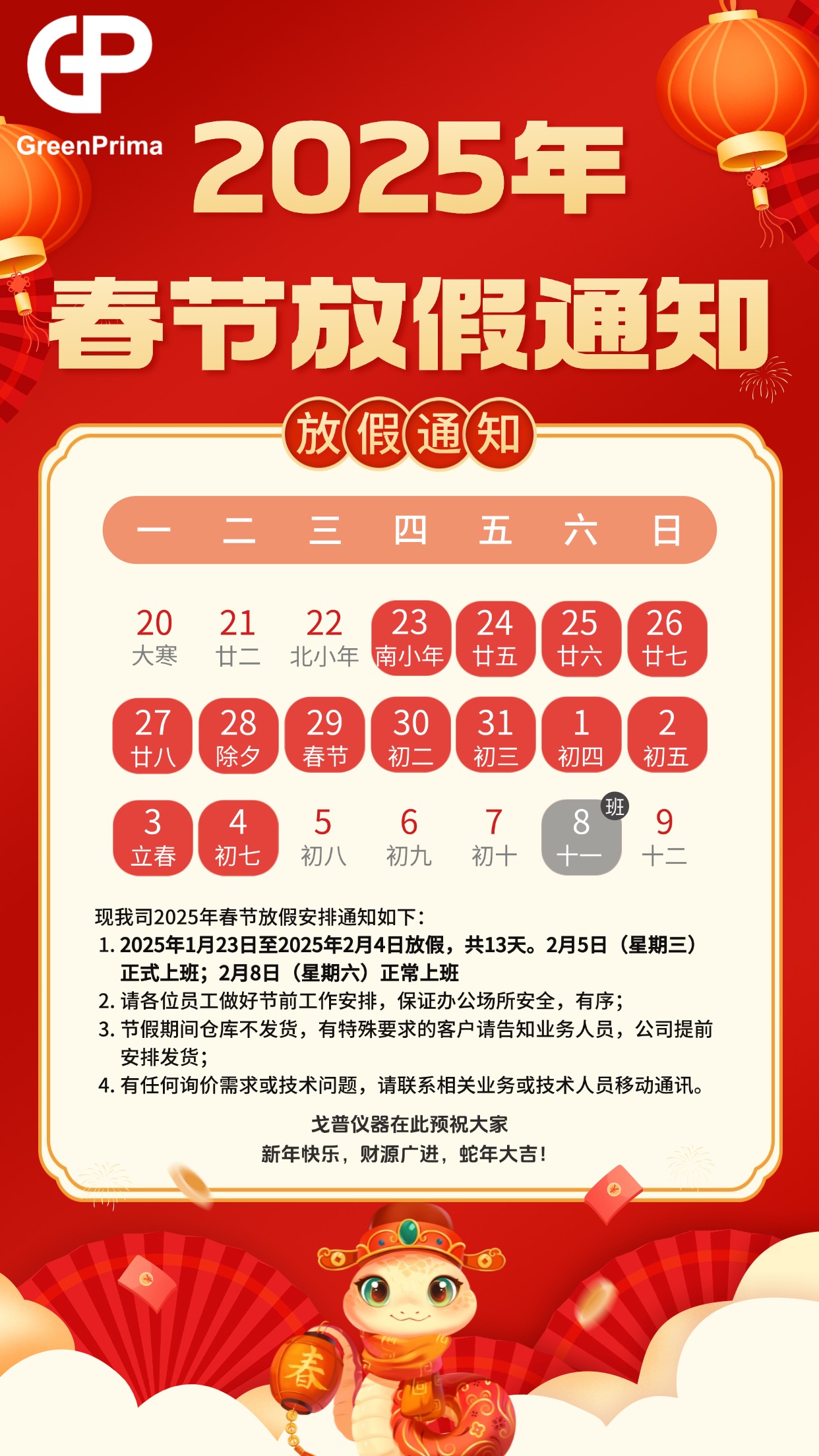戈普儀器2025年春節(jié)放假安排:2025年1月23日至2025年2月4日放假,共13天。2月5日(星期三)正式上班;2月8日(星期六)正常上班